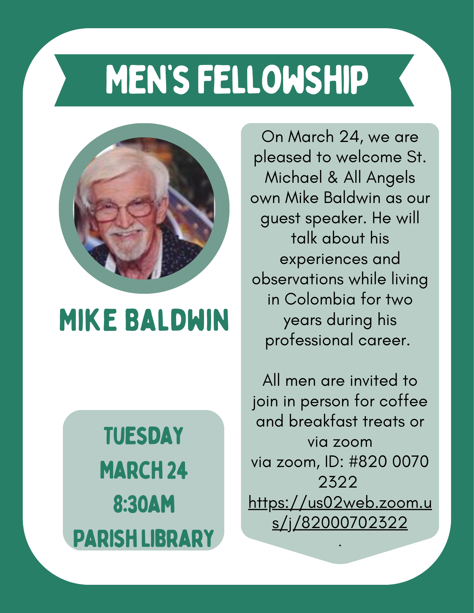 Hybrid Men's Fellowship meet via Zoom and in person @ St. Michaels, Sanibel.