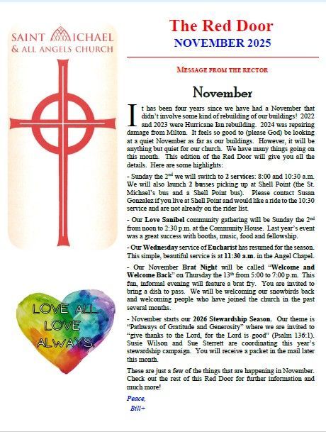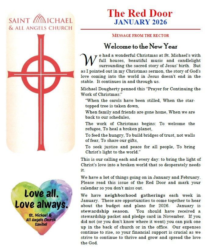 The Red Door, our monthly Saint Michael's newsletter, is emailed as a PDF to anyone interested in receiving one and a printed hard copy is available upon request - click on the Red Door button or links below.